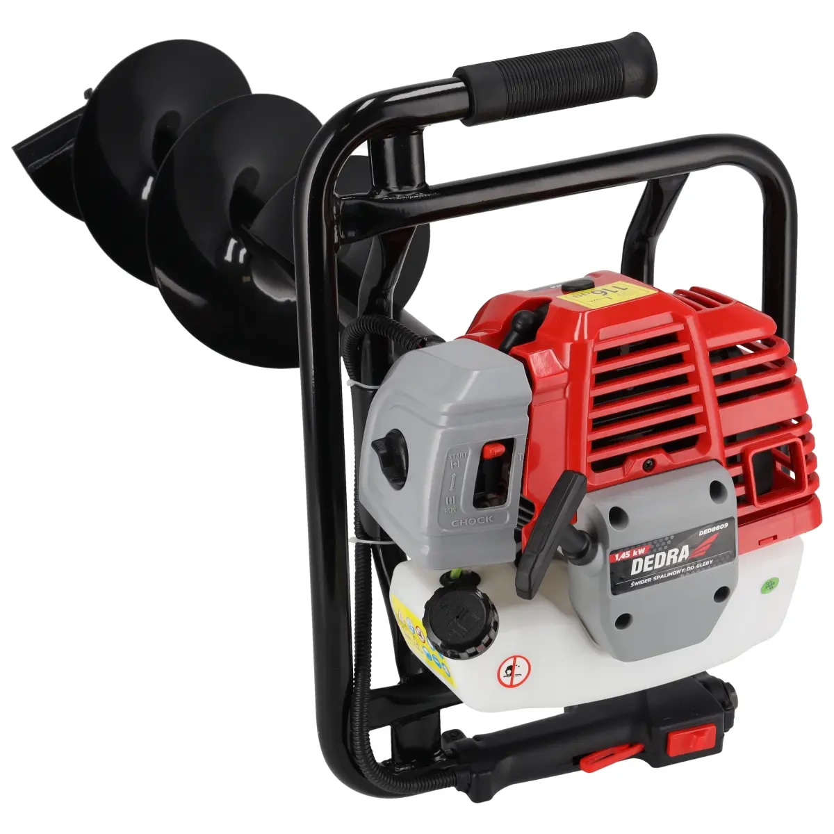 Benzinska bušilica za zemlju DEDRA DED8809 snage 1.45 kW i zapremine 52 cc idealna je za bušenje rupa za stubove, sadnju drveća i razne zemljane radove. U setu dolaze tri spiralna svrdla (100, 150 i 200 mm), a snažan dvotaktni motor omogućava brzo i efikasno bušenje.